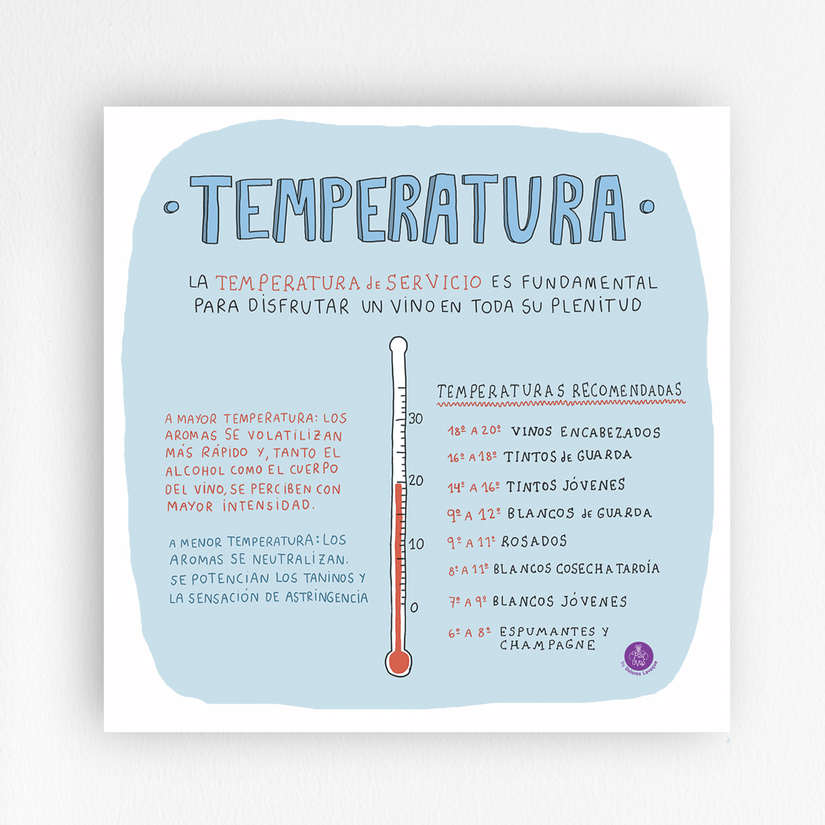 Lámina de 21 x 21 cm, papel de 300 g ilustrada a cuatro colores. Describe las temperaturas a las que conviene servir y tomar cada tipo de vino, ideal para tener a mano para disfrutarlos mejor. #PisaUvasTips para vos, para los amantes del vino