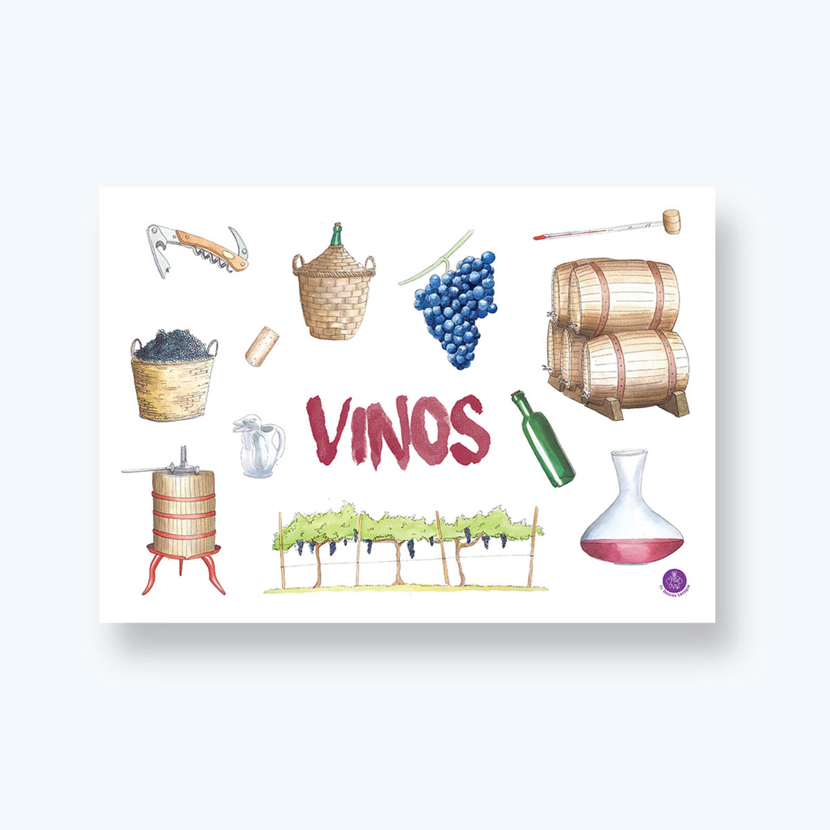 42 x 30 cm, papel de 170 g. formato horizontal. Lámina sobre acuarela de nuestra artista invitada Sol de Ángelis, también conocida como Fulana Who. Su interpretación de “Vinos”, con elementos que lo definen, de delicado trazo y lindísimos colores sentimos que nos representa muy bien. Desde hoy Sol empieza a pisar uvas con nosotros, ¡bienvenida!